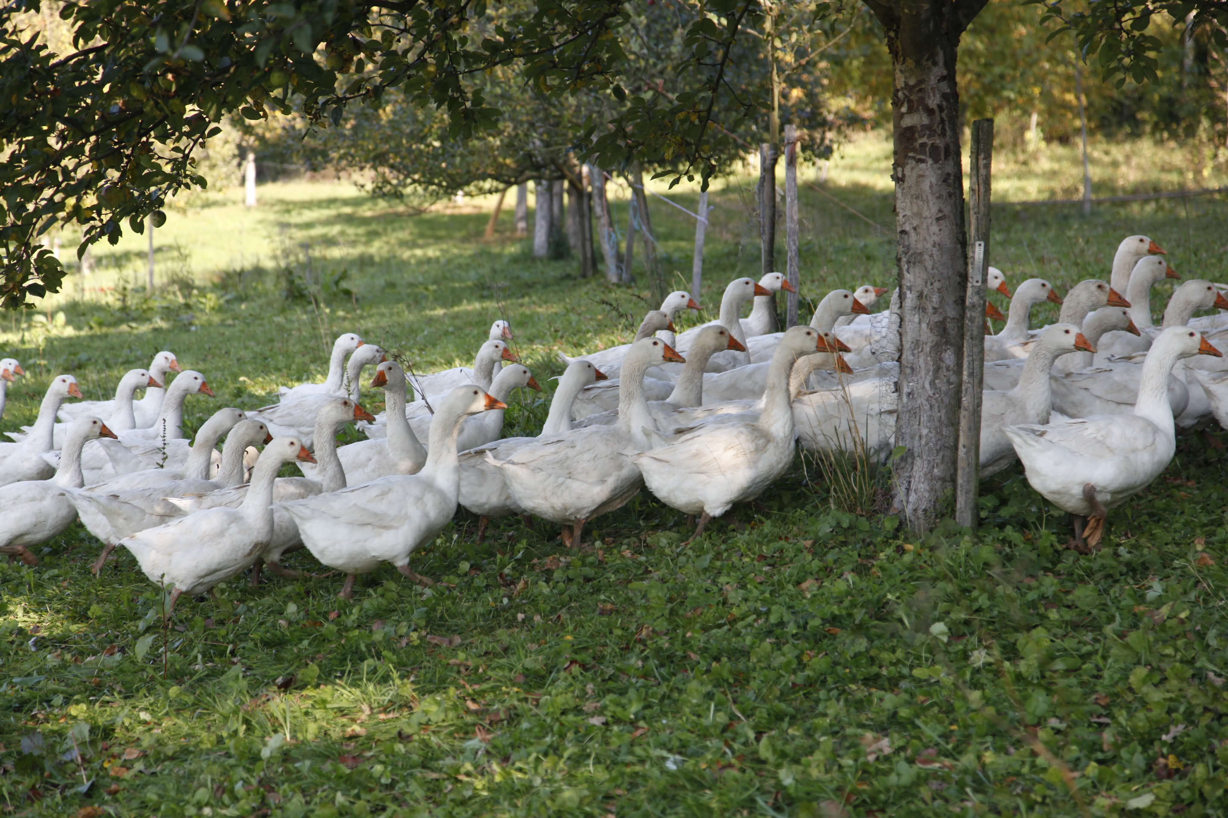 Jeden Morgen lassen wir die weiße Gänseschar ins Freie spazieren und geleiten sie abends wieder in den sicheren Stall. Das passiert ganz automatisch im sprichwörtlichen Gänsemarsch. Wir sorgen für das Wohl unserer Weidegänse, indem wir auf ihre Bedürfnise eingehen und ihnen einen Badeteich und zusätzliche Badewannen und rund 200 qm saftiges Wiesengras pro Gans zur Verfügung stellen. Wir überlassen es den Gänsen selbst, ob sie sich nach den Mahlzeiten zur Körperpflege oder zum Ausruhen lieber ein sonniges Plätzchen oder den Schatten der Obstbäume aufsuchen.